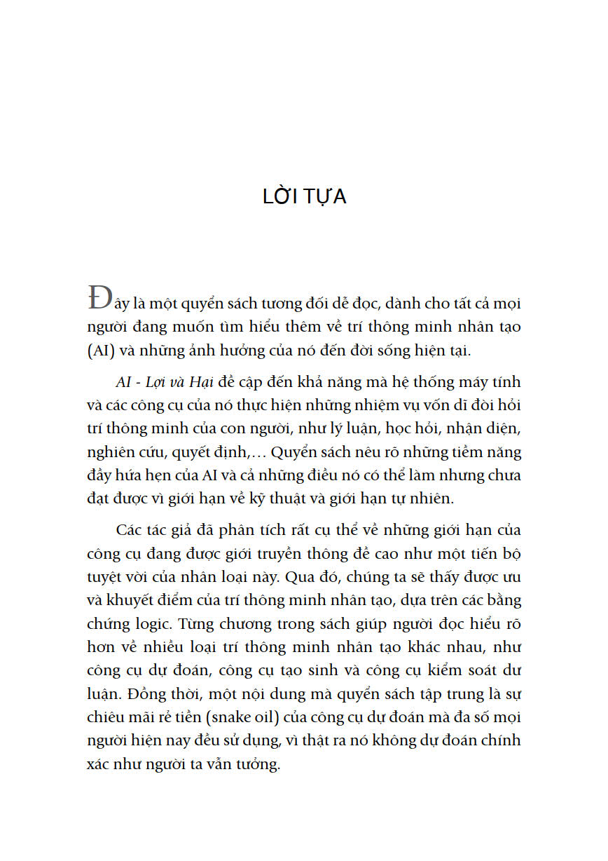 Tại sao các huyền thoại về AI vẫn tồn tại? Động lực nào dẫn đến những lời quảng cáo thổi phồng về AI? Quyển sách này là một hướng dẫn cần thiết để giúp bạn nhận diện các trò bịp AI và những trường hợp quảng cáo thổi phồng quá mức về công nghệ này.