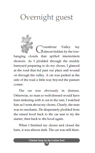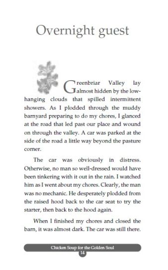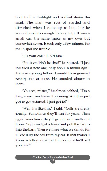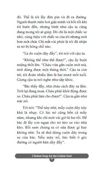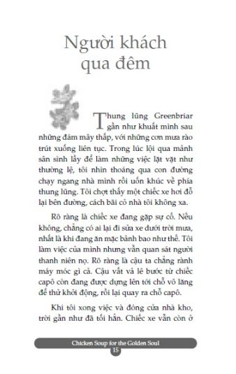 Chúng tôi hi vọng Golden Soul sẽ truyền cảm hứng để bạn có thể kể những câu chuyện của chính mình cho những người trẻ hơn mà bạn gặp trong cuộc sống – và cho cả những người có “tâm hồn tươi trẻ.” Thông qua quyển sách Chicken Soup for the Golden Soul, chúng ta hãy cùng nhau tôn vinh cuộc sống. Hãy đọc từng truyện một. Hãy để chúng xoa dịu tâm hồn, mang đến những nụ cười thoải mái và nhóm lên ngọn lửa trong tâm hồn bạn. Và mong rằng các bạn sẽ truyền nh ững câu chuyện này cho nhiều người khác nữa.