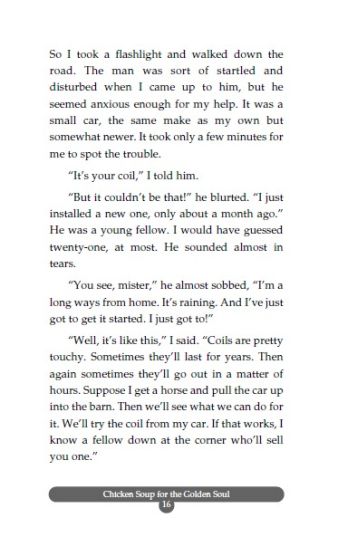 Trong tập Chicken Soup for the Golden Soul, chúng tôi đã chọn in những câu chuyện xoay quanh những tấm lòng cao thượng và chính những câu chuyện đó đã chinh phục con tim độc giả. Một số câu chuyện kể về niềm hạnh phúc được tận hưởng mối quan hệ hòa thuận giữa các thế hệ, niềm vui khi được sống với các thú vui tao nhã cũng như tạo ra nguồn sinh lực mới, được thưởng thức những cột mốc đánh dấu sự thay đổi và để lại phía sau những điều đã già cỗi. Nhiều câu chuyện liên quan đến việc nuôi nấng và dạy dỗ con cháu, trong khi một số chuyện khác thì tập trung vào sự thật của tuổi tác.