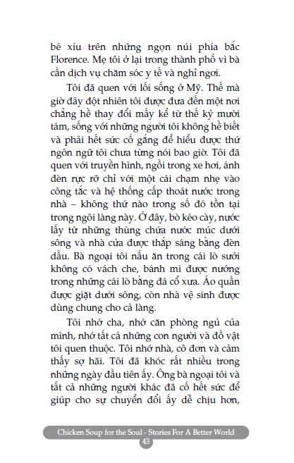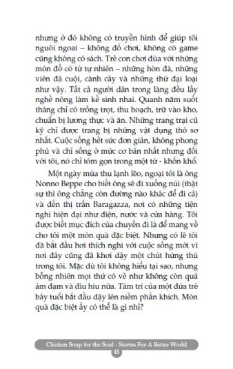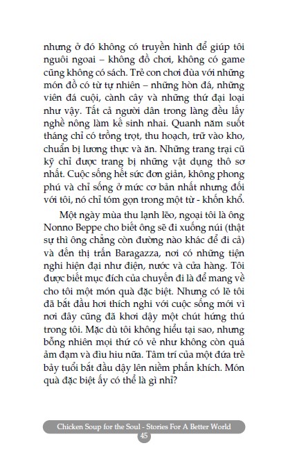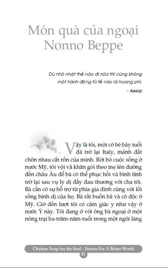 Mong rằng bạn sẽ dành ra chút thời gian nghĩ lại về những câu chuyện đã tác động tích cực đến bạn – dù bạn đọc trong sách của chúng tôi hay trong những cuốn sách khác, hay chính bạn gặp phải trong cuộc sống – và hồi tưởng lại cảm giác phấn khích tuyệt vời bạn đã có khi lần đầu tiên cảm nhận. Những câu chuyện trong Chicken Soup for the Soul Stories for a Better World – Tin vào ngày mai truyền cảm hứng và chia sẻ niềm vui trong cuộc sống, về niềm tin vào những điều tốt đẹp, bất kể những khó khăn trước mắt.