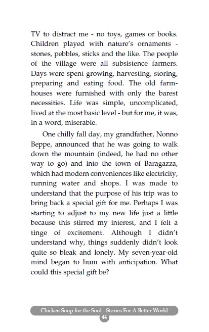 Câu chuyện về một góa phụ luôn buồn bã, mất niềm tin vào cuộc sống từ khi chồng bà qua đời bỗng nhiên phát hiện ra nghị lực sống phi thường từ một người có hoàn cảnh như mình, “chúng ta có thể mất đi thức ăn, sự tự do hoặc vật chất nhưng không thể mất đi tình yêu cuộc sống”. Câu chuyện về một cô giáo dạy tiếng Anh cho những học sinh đa chủng tộc (là những cụ già, những người lao động nhập cư nghèo khổ) đã rất hạnh phúc khi được họ tặng cho một chiếc áo khoác cực đẹp – vốn là mơ ước của cô… Và rất nhiều câu chuyện khác đã thật sự mang đến cho độc giả sự tin tưởng vào cuộc sống, vào điều kỳ diệu của tình yêu thương và sự chia sẻ.