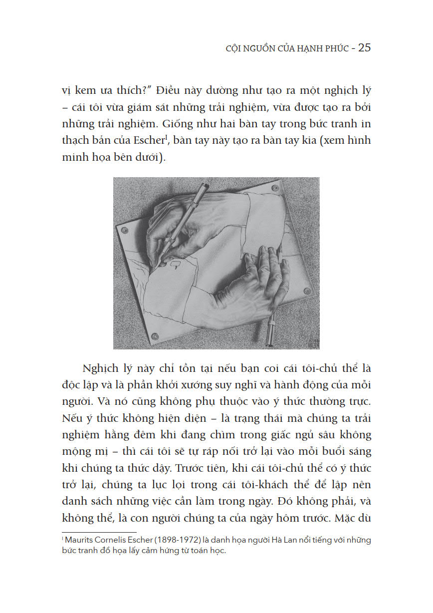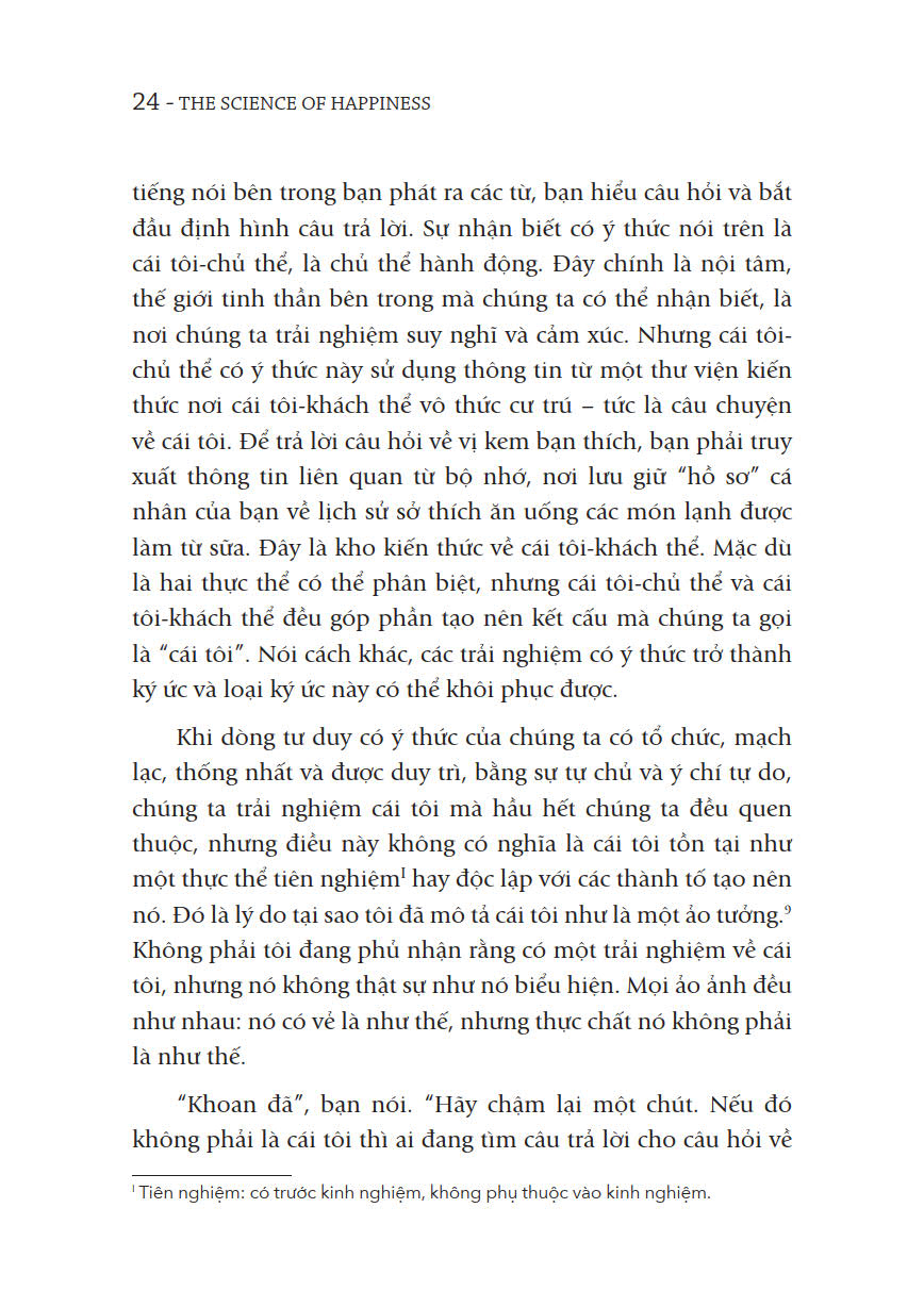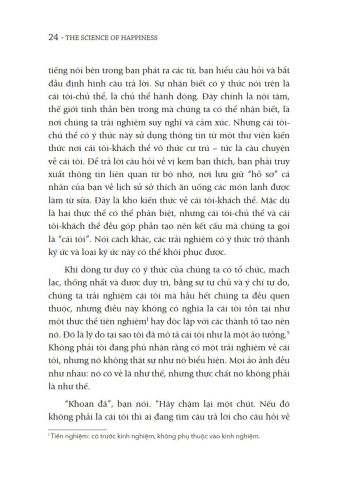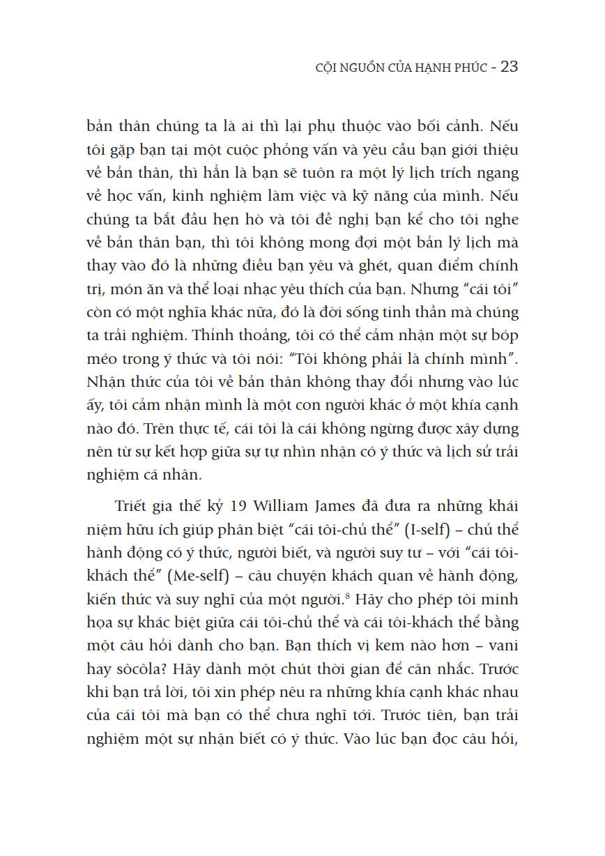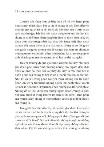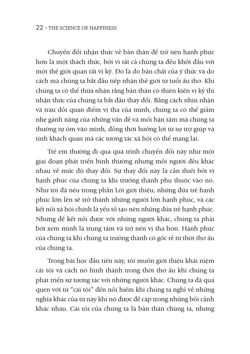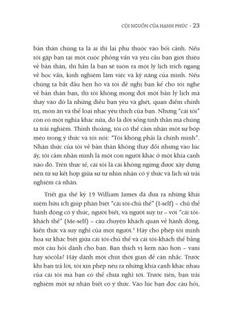 Vì lẽ đó, “Cội nguồn của hạnh phúc” không phải là một cuốn sách “tu dưỡng cái tôi”. Thậm chí, ở nhiều phương diện, nó khiến bạn nhận thấy sự cần thiết phải “tiêu hủy cái tôi”. Bởi cái tôi quá vị kỷ có thể là điều ngăn trở chúng ta hạnh phúc. Tuy nhiên, chúng ta cũng không nên cố gắng loại bỏ ý thức về cái tôi bằng cách trở nên hoàn toàn vị tha. Nếu chỉ nghĩ và cảm thông cho người khác, chúng ta có nguy cơ đánh mất hoàn toàn ý niệm về bản thân, và điều này cũng quan trọng đối với sức khỏe tâm thần của chúng ta không kém sự kết nối với người khác.