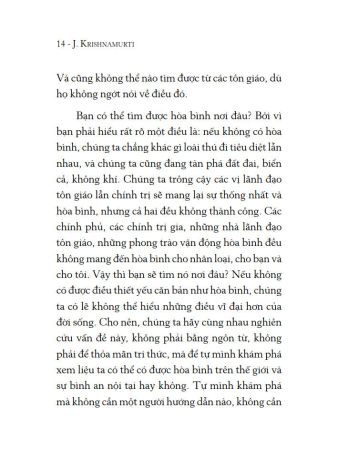 Vậy, để chấm dứt xung đột, chấm dứt bạo lực, ta phải làm gì? Krishnamurti khẳng định bạn không thể kiếm tìm hòa bình nơi các vị lãnh đạo lẫn tôn giáo, cả hai đều không thành công dù họ rao giảng rất nhiều về hòa bình.