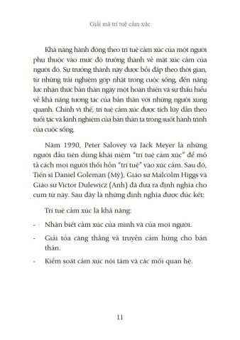 “Giải mã trí tuệ cảm xúc” giúp bạn hiểu được khởi nguồn của cảm xúc, cách chúng tác động đến bạn và quan trọng hơn là cách tận dụng sức mạnh của cảm xúc để đạt được thành công. Trong môi trường kinh doanh nhiều biến động như hiện nay, bạn cần phải linh hoạt, điềm tĩnh, thích nghi tốt và có khả năng làm chủ bản thân. Khi gặp trở ngại, bạn cần có khả năng dẫn đầu và truyền cảm hứng cho đồng đội, giúp họ giữ vững ý chí và quyết tâm để đạt được mục tiêu chung. Và khi các mối quan hệ với đồng nghiệp, khách hàng, bạn bè, người thân, vợ/chồng… có nguy cơ rạn nứt, bạn cần cố gắng tìm cách hòa hợp với mọi người. Chính năng lực trí tuệ cảm xúc sẽ giúp bạn thực hiện tất cả những điều này.