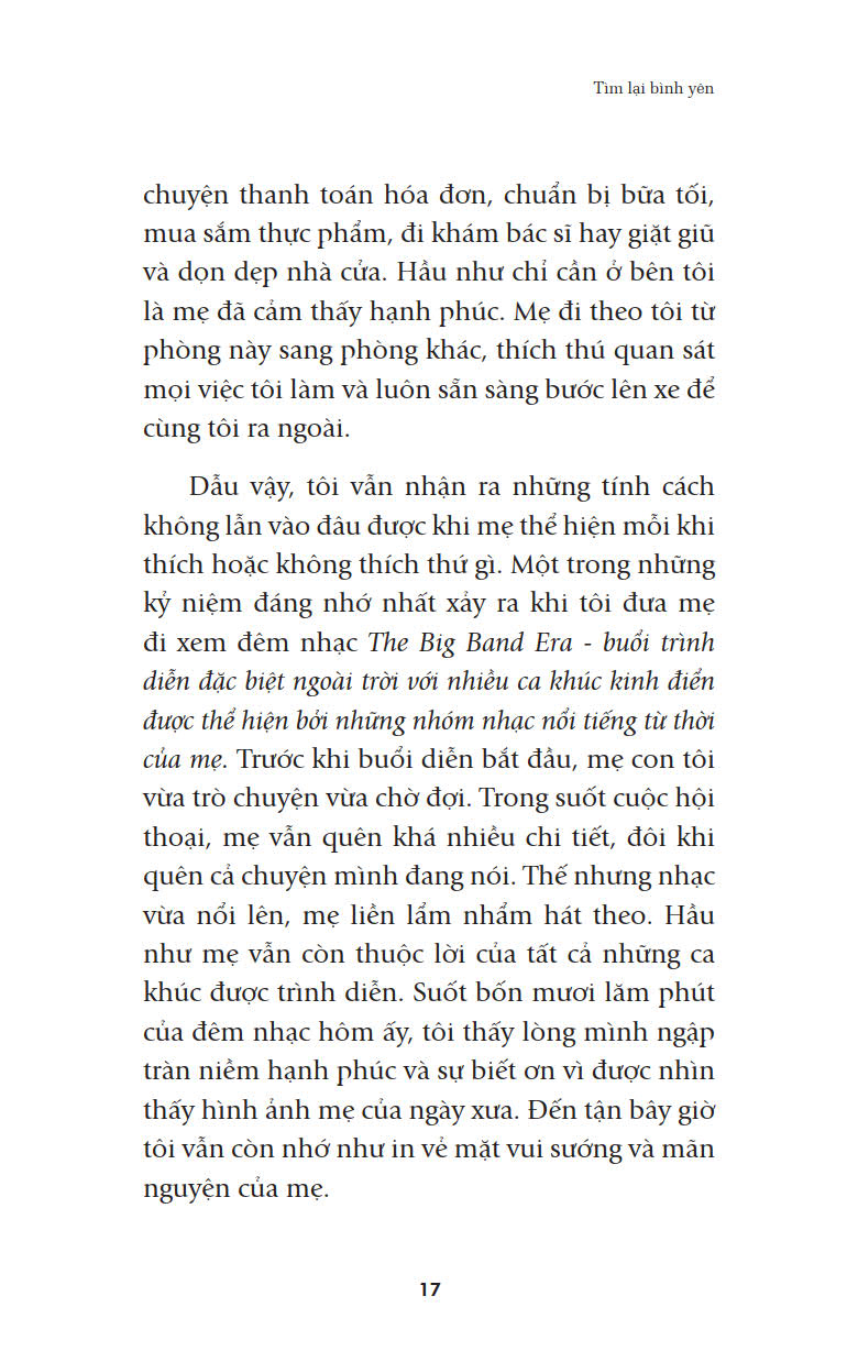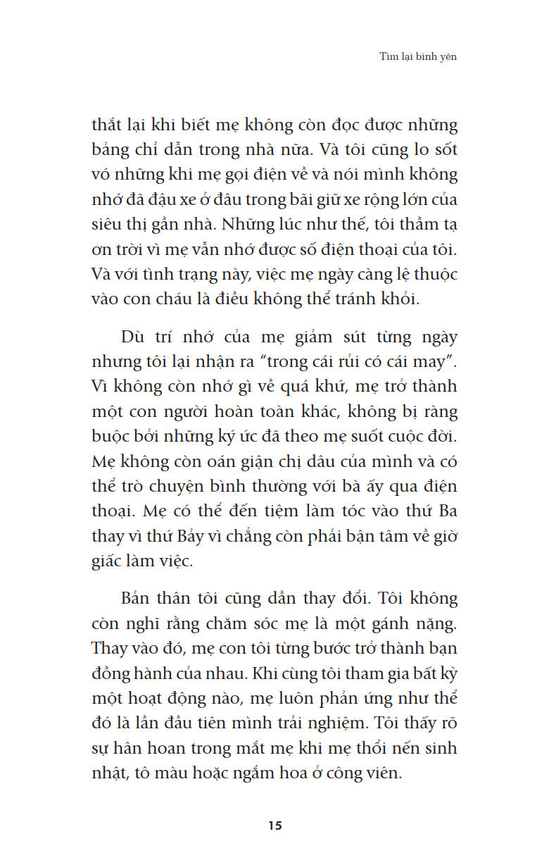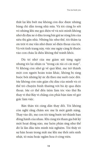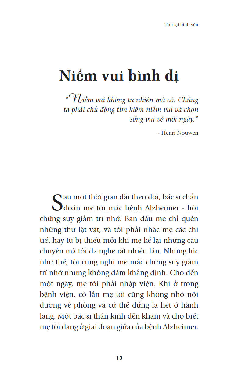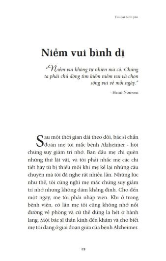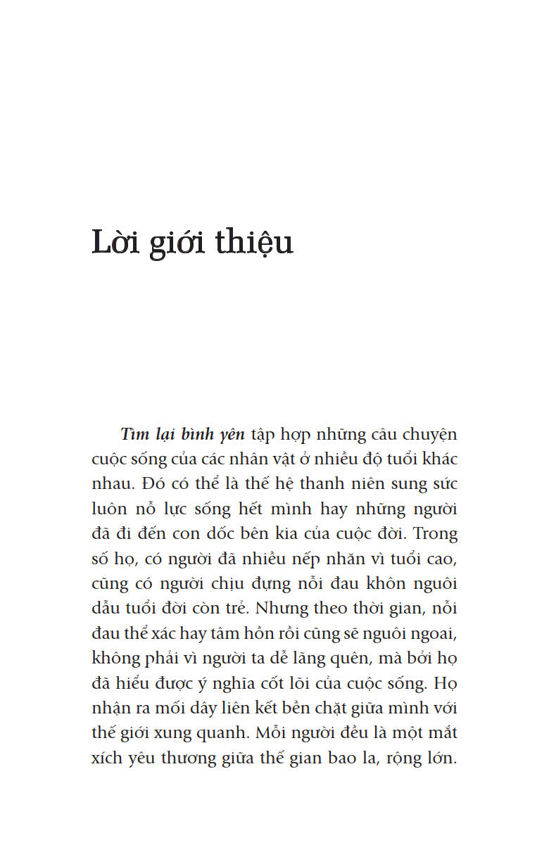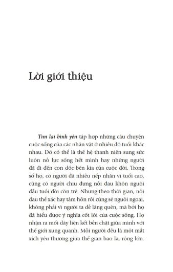 Cuốn sách nhỏ “Tìm lại bình yên” (Nhiều tác giả, First News tổng hợp; Biên dịch: Phan Quang – Việt Hà – Hoa Phượng) sẽ giúp bạn đọc nhận rarằng: “Không có kết thúc. Không có khởi đầu. Chỉ có niềm đam mê bất diệt dành cho cuộc sống.”(Federico Fellini), như Ruth Heidrich, Tiến sĩ Triết học không may mắc bệnh ung thư vú, sau những phút tuyệt vọng đã đứng lên giành lấy sự sống bằng tất cả sức lực của mình và rất nhiều những nhân vật khác; các câu chuyện khác trong “Tìm lại bình yên” sẽ cho bạn đọc sẽ nhận thấy tình yêu thương cuộc sống này là vô cùng sâu sắc và mãnh liệt.