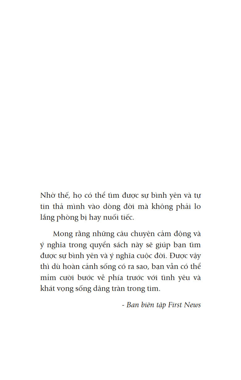 Chính tâm hồn vui tươi, thái độ sống tích cực đã giữ lấy sự dồi dào, căng tràn cho bất kỳ thể xác nào, dẫu có đang vật lộn đấu tranh trên giường bệnh, dẫu là đã gần trở về với cát bụi, hoặc dẫu có cất giữ bên trong mình những hộp kỷ niệm buồn khổ đã qua. Mong rằng bạn thấy hạnh phúc với những câu chuyện hài hước, cảm động và tuyệt diệu trong cuốn sách này. Để rồi dẫu hoàn cảnh sống của bạn có ra sao, bạn vẫn sẽ mỉm cười bước tới, với tình yêu và khao khát sống dâng tràn trong tim.