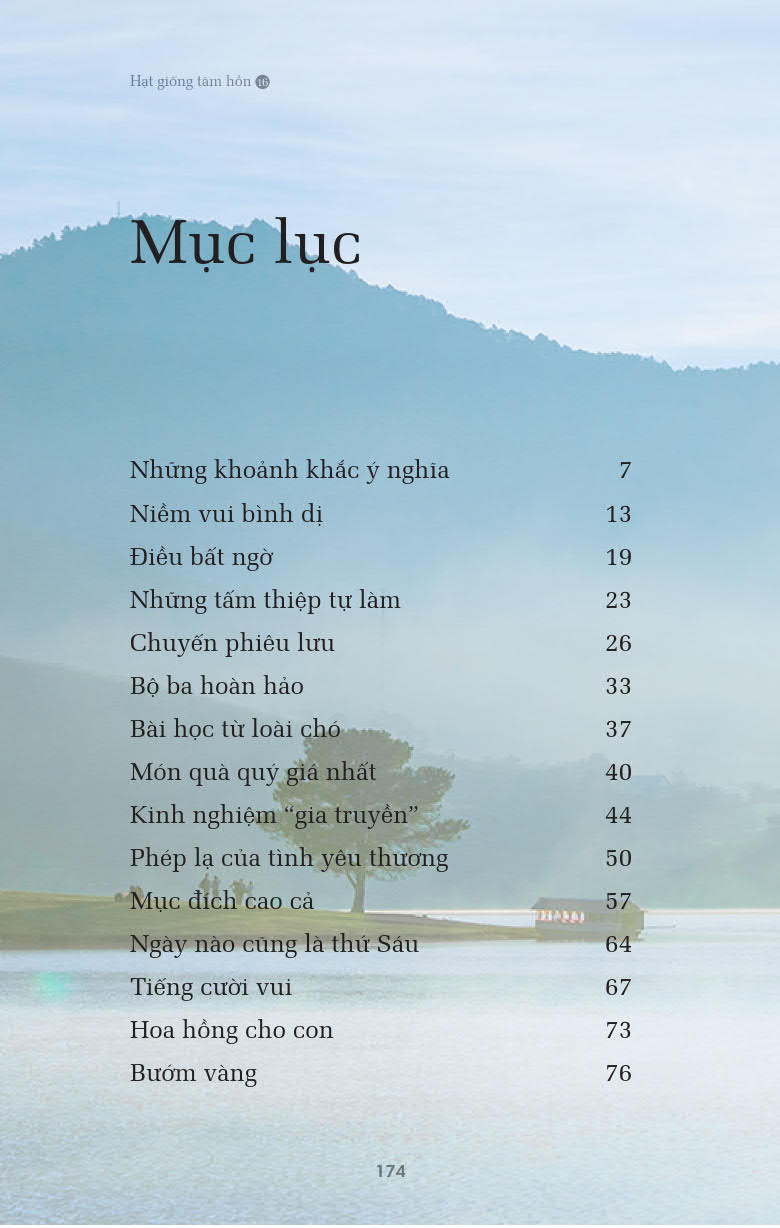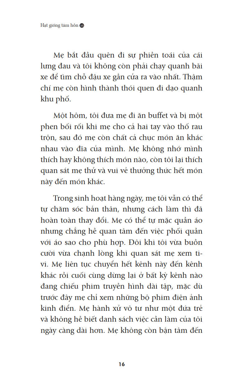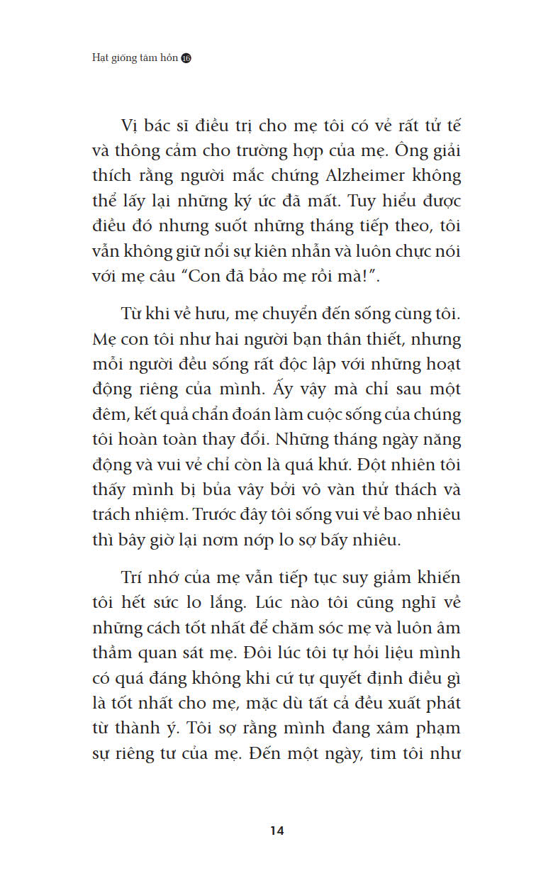 Khi cầm trên tay Hạt giống tâm hồn 16 “Tìm lại bình yên”, các bạn sẽ bắt gặp rất nhiều những nhân vật ở những lứa tuổi khác nhau. Đó có thể là thế hệ thanh niên sung sức luôn nỗ lực hết mình trong cuộc sống, cũng có khi là những người đã bước về phía dốc bên kia của cuộc đời. Ở họ, có người nếp nhăn đã nhiều theo đà giàm sút của sức khỏe,cũng lại có người luôn chất chứa những nỗi đau khôn nguôi dẫu tuổi đời hãy còn rất ít. Song, theo thời gian, những đau đớn ấy rồi cũng phải phai nhạt, cả trong thể xác lẫn tâm hồn. Không phải họ lãng quên, mà bởi họ hiểu ra được điều cốt lõi của cuộc sống. Bởi họ nhận ra mối dây liên kết bền chặt giữa mình với mọi vật xung quanh. Những mối dây này có thể tồn tại dưới tên gọi tình thương, cũng có thể có tên gọi tưởng nhớ… nhưng tất cả đều khẳng định ý nghĩa của bản thân họ với cuộc sống này: Họ là một mắt nối yêu thương giữa thế gian bao la này. Và nhờ thế, họ có thể tìm thấy sự bình an, có thể chan hòa thả mình vào dòng đời mà không vương vấn chút phòng bị, nuối tiếc nào. Họ trẻ với một tâm hồn tươi sáng luôn hướng đến điều tươi đẹp trong cuộc sống. Tất cả là nhờ sức sống kỳ diệu nơi tâm hồn.