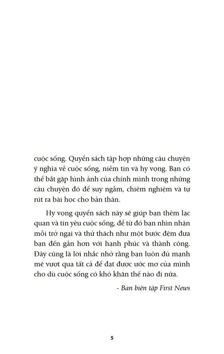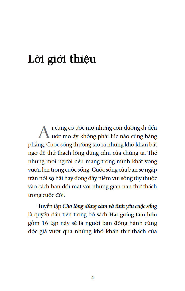 Đó chính là ý tưởng chính của hai tập sách Hạt giống tâm hồn: Cho Lòng Dũng Cảm và Tình Yêu Cuộc Sống do First News (NXB TP. HCM) phát hành. Tập sách gồm 100 bài viết, truyện ngắn hay, có ý nghĩa sâu sắc (mỗi tập 50 truyện), gần gũi với cuộc sống, mang tính tự nhận thức và giáo dục cao.