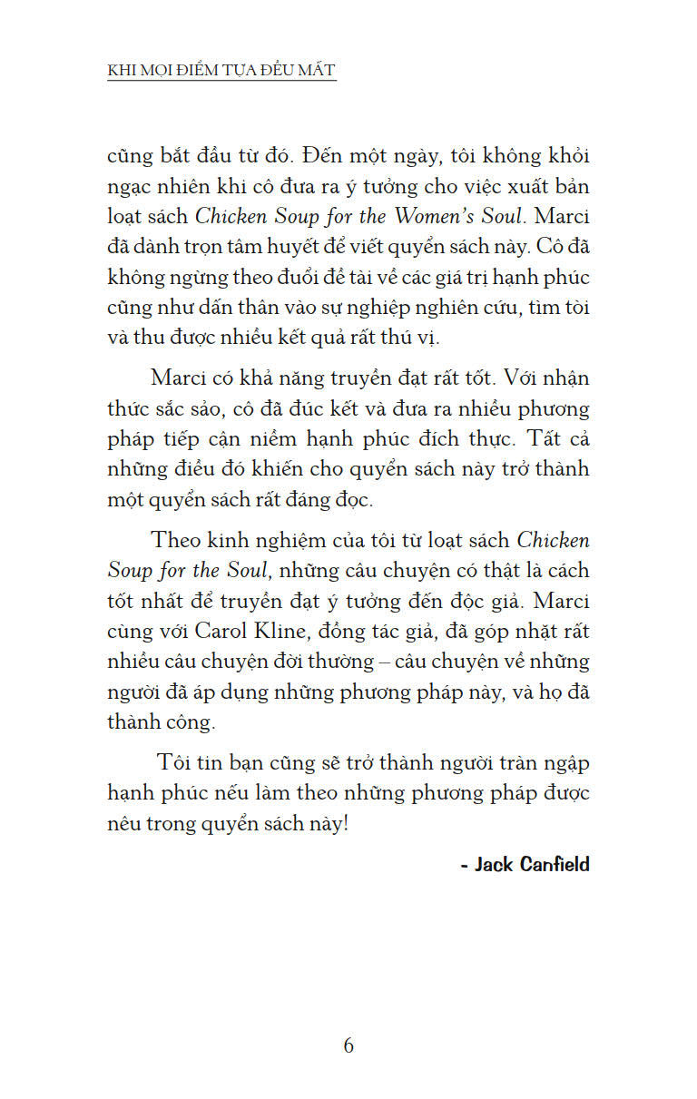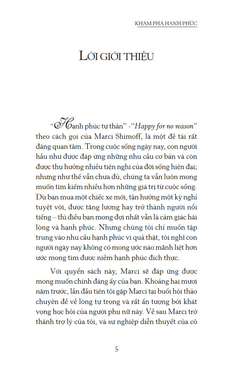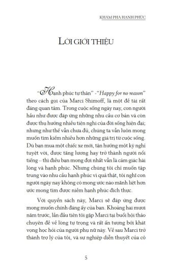 Với Happy for No Reason – Khi mọi điểm tựa đều mất, tác giả Marci Shimoff đã có một cuộc cách mạng về quan niệm hạnh phúc. Trong khi phần lớn những quyển sách ở thể loại này hướng vào việc giúp con người tìm kiếm hạnh phúc từ những yếu tố bên ngoài thì Happy for No Reason lại hướng vào những yếu tố nội tâm. Nhờ vậy, bạn sẽ tìm thấy những phương thức tuy đơn giản nhưng lại rất hữu hiệu giúp bạn trải nghiệm một cảm xúc mới – hạnh phúc tự thân – bất kể mọi tác động tiêu cực từ bên ngoài.