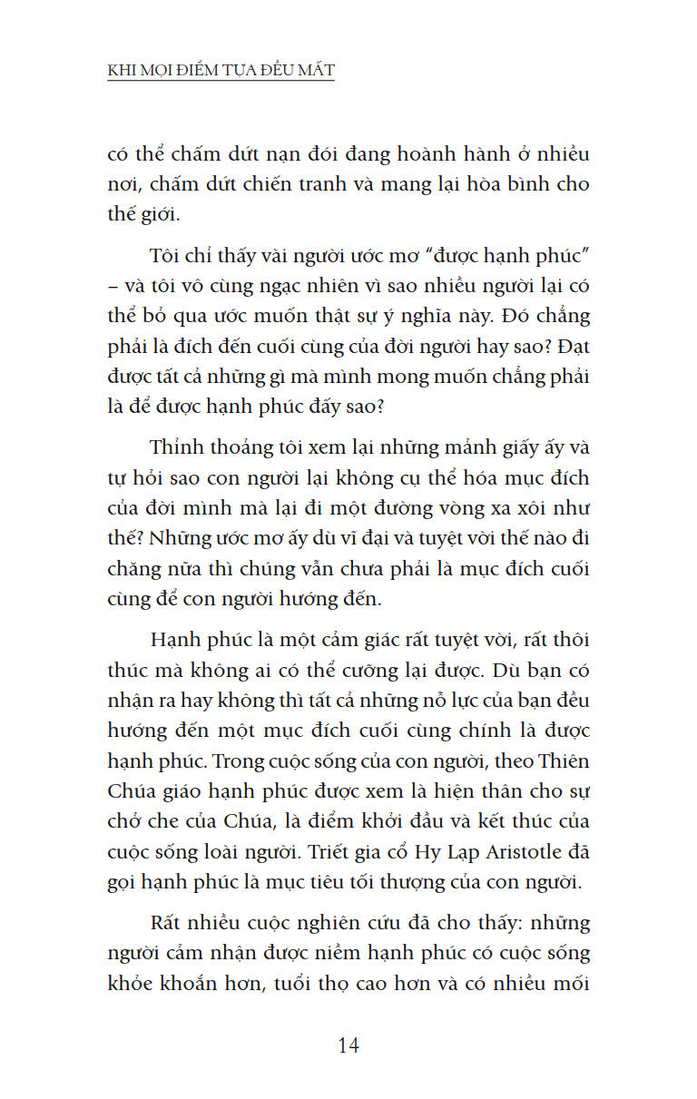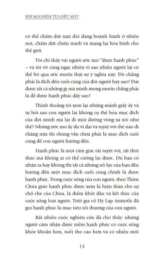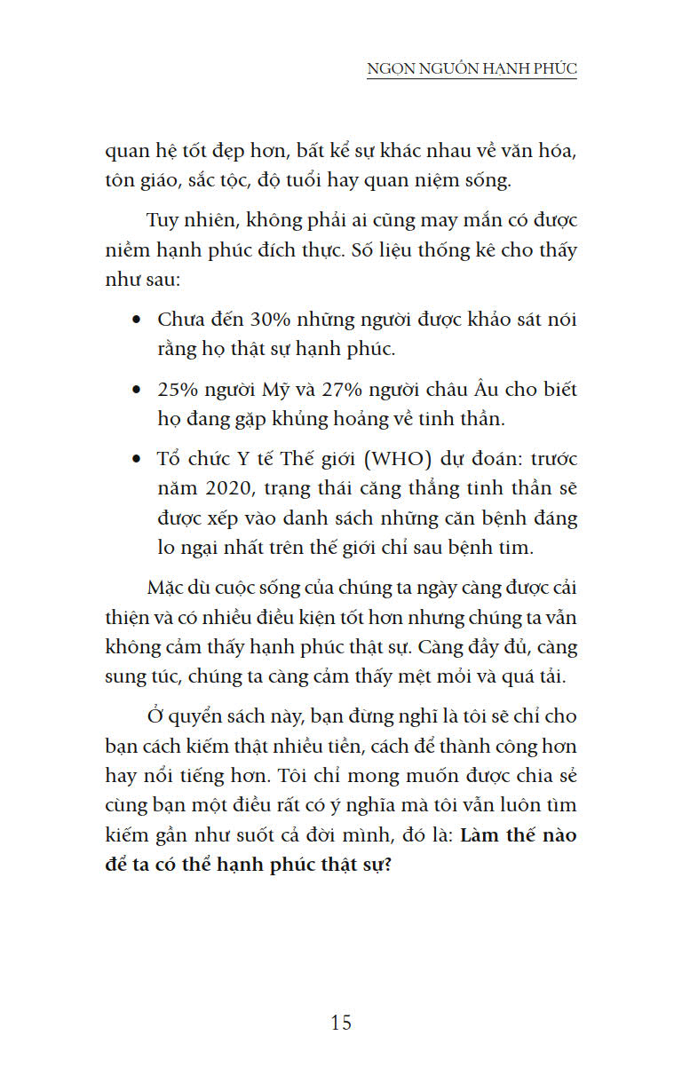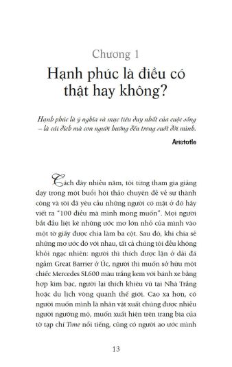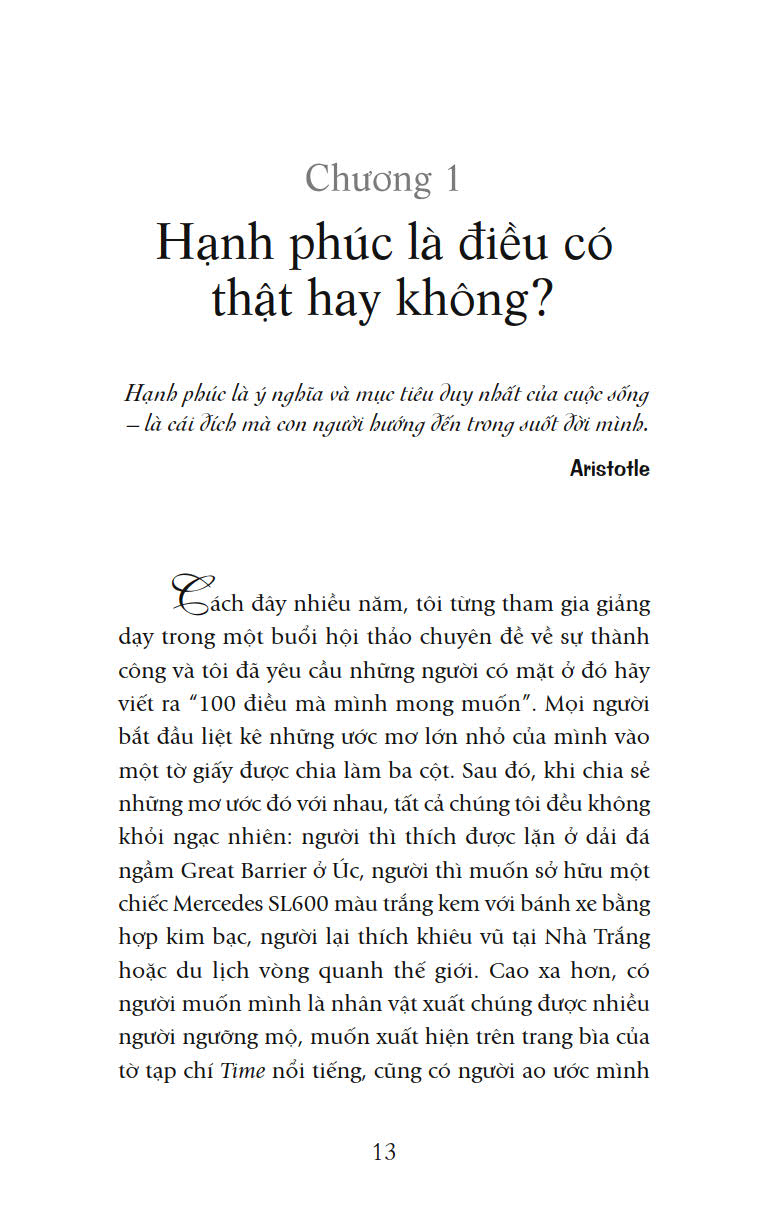 Dù bạn mua một chiếc xe mới, tận hưởng một kỳ nghỉ tuyệt vời, được tăng lương hay trở thành người nổi tiếng – thì điều bạn mong đợi nhất vẫn là cảm giác hài lòng và hạnh phúc. Và cuốn sách này tập trung nhiều vào nhu cầu hạnh phúc vì quả thật con người ngày nay không có mong ước nào mãnh liệt hơn ước mong tìm được niềm hạnh phúc đích thực.