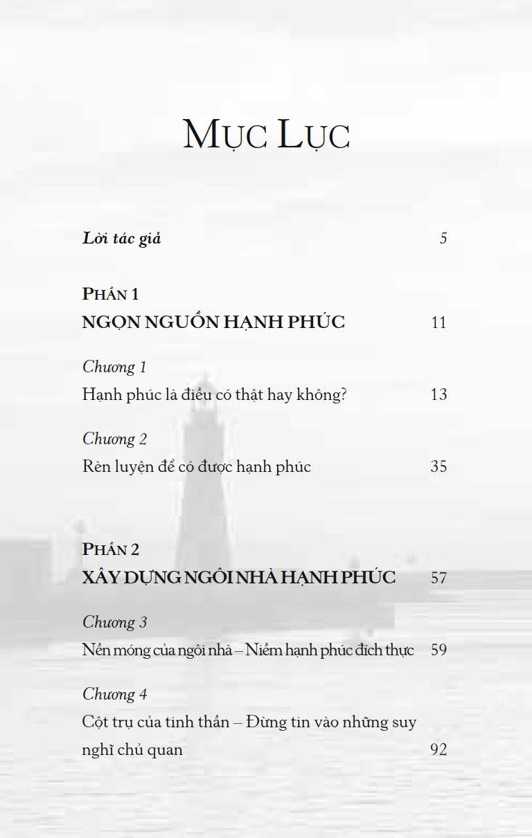 Theo đó, có bảy bước rất đơn giản giúp bạn trải nghiệm niềm hạnh phúc đích thực. Với hình ảnh Ngôi nhà ẩn dụ cho cuộc sống con người, tác giả đã mượn hình ảnh này làm biểu tượng cho ý tưởng của mình: bảy bước để xây dựng “ngôi nhà hạnh phúc”.