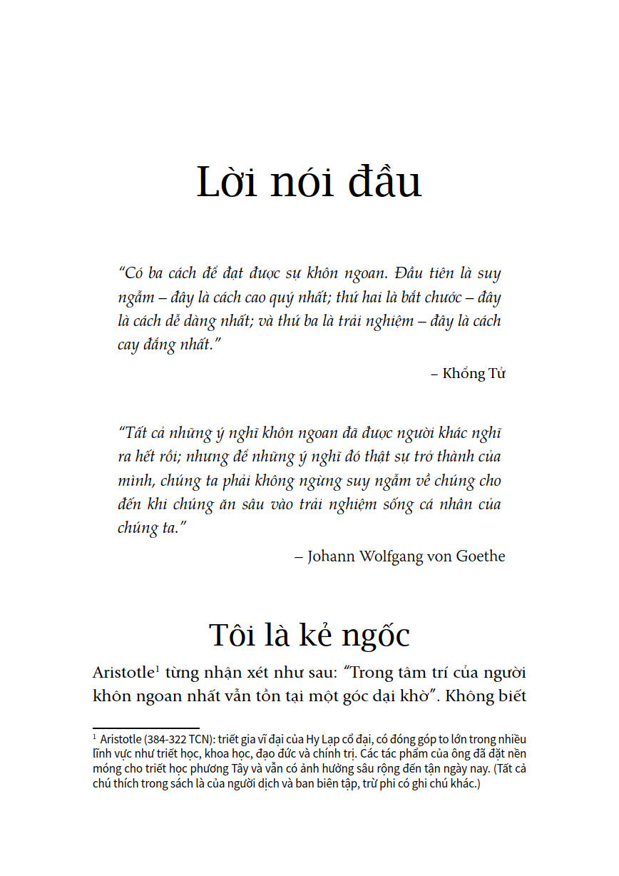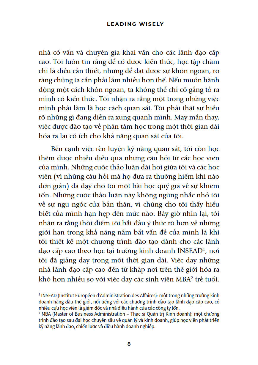 Ở phần đầu sách, tác giả dẫn lời Khổng Tử: “Có ba cách để đạt được sự khôn ngoan. Đầu tiên là suy ngẫm – đây là cách cao quý nhất; thứ hai là bắt chước – đây là cách dễ dàng nhất; và thứ ba là trải nghiệm – đây là cách cay đắng nhất”. Câu nói này đồng thời đã tóm gọn thông điệp cốt lõi mà Kets de Vries muốn truyền tải: thế giới ngày nay không thiếu người thông minh, giỏi giang mà thiếu những người khôn ngoan và can đảm.