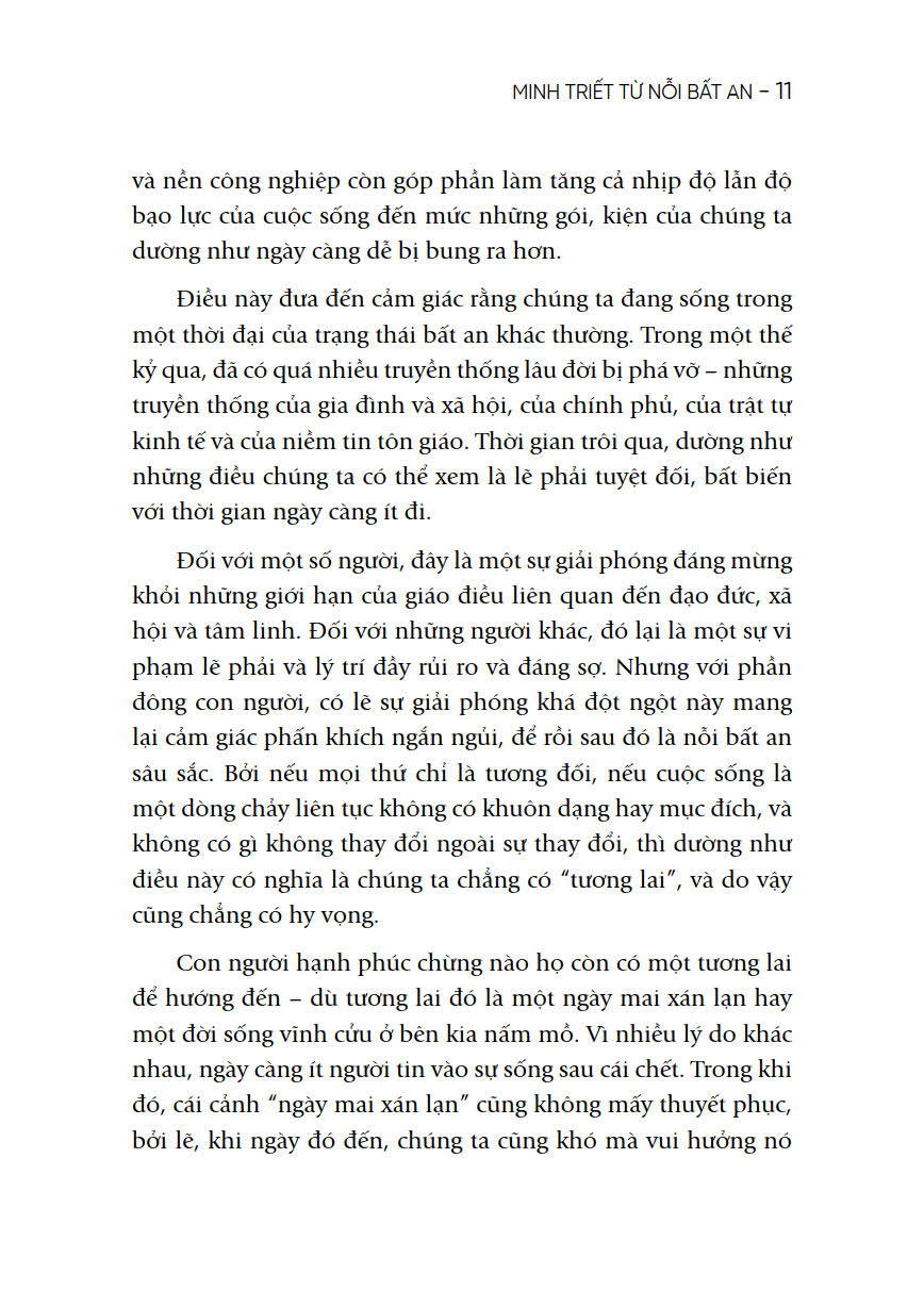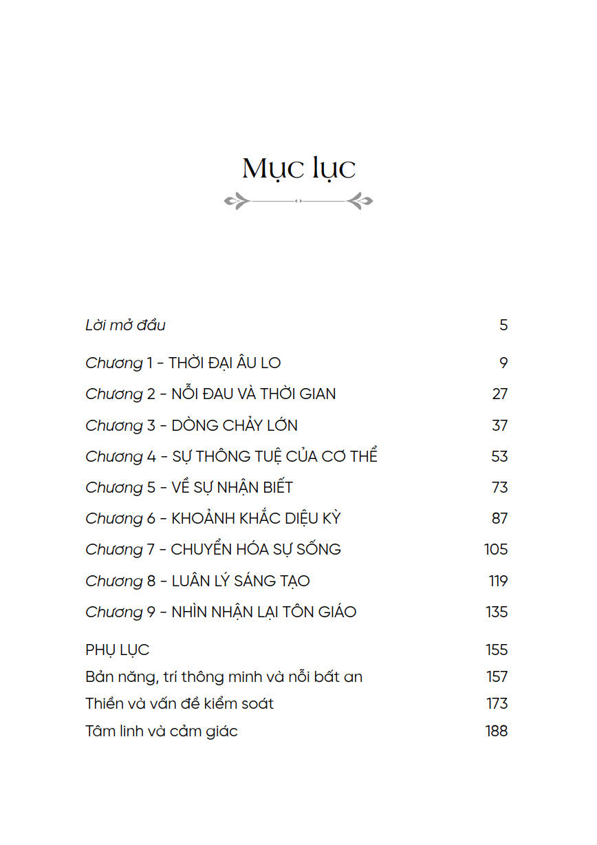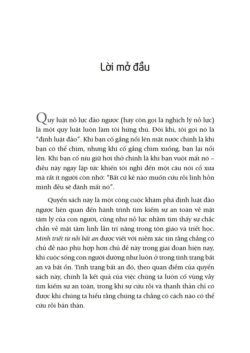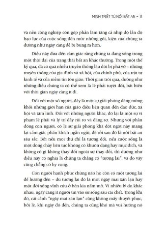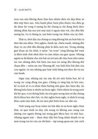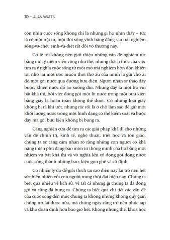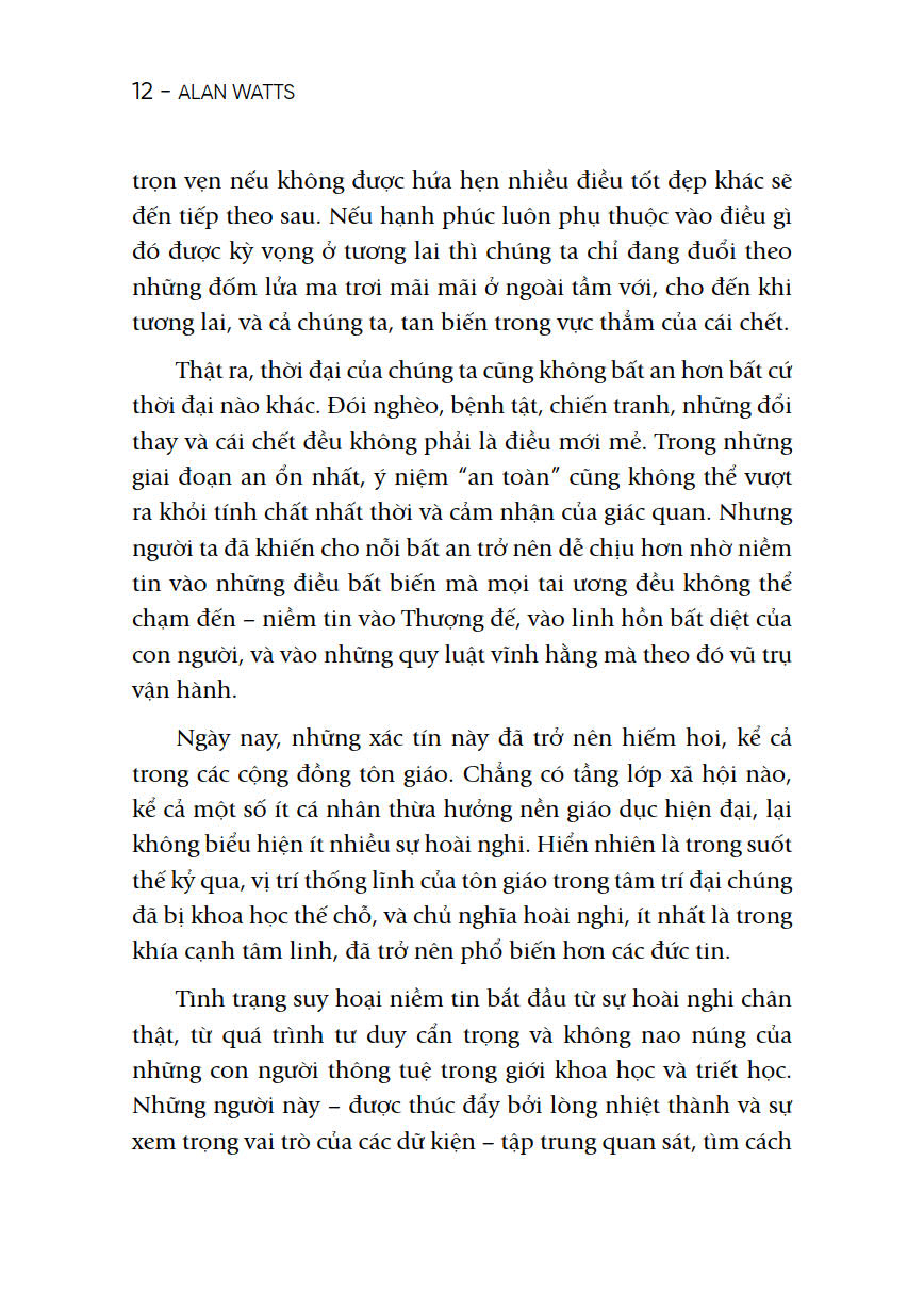 Với 200 trang sách, Alan Watts sẽ giúp người đọc nhận ra rằng nỗi lo âu không chỉ là vấn đề cá nhân, mà còn là một đặc điểm của thời đại. Nhưng chính từ sự bất an ấy, con người sẽ có thể tìm thấy một dạng minh triết mới: minh triết của việc chấp nhận sự vô thường và sống trọn vẹn trong dòng chảy của đời sống.