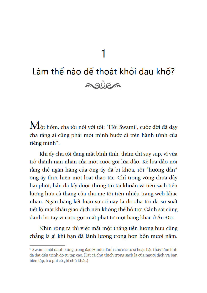 Om Swami gợi ý con đường giải thoát cho những ai đang chìm đắm trong đau khổ là tìm về chánh niệm và chuyển hóa cảm xúc. Ông viết: “Đừng giữ lấy hay trút bỏ những cảm xúc tiêu cực một cách bừa bãi, mà hãy khéo léo chuyển hóa chúng. Chỉ cần chú tâm và tỉnh thức trong từng khoảnh khắc, điều đó sẽ có ích cho bạn”.