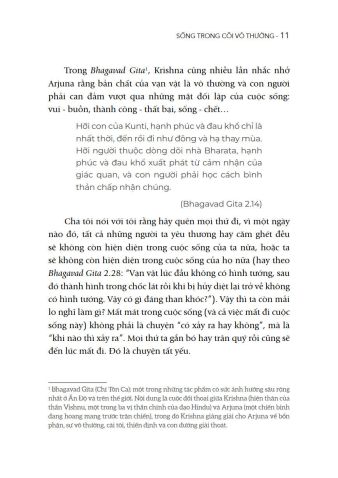 “Sống trong cõi vô thường” không phải là quyển sách ta có thể ngồi xuống đọc hết ngay một lần, mà là một cuốn sổ tay ta cần mỗi lúc ưu tư. Ba phần chính: Luân hồi, Sự cô đơn và Bản ngã - trả lời rõ ràng cho 33 câu hỏi quan trọng luôn neo giữ tâm trí con người trong khổ đau. Với ngôn ngữ hiện đại, dễ hiểu, kèm theo những mẩu chuyện ngụ ngôn và điển tích Phật giáo, Om Swami mang giáo lý đến thật gần đời sống hằng ngày.