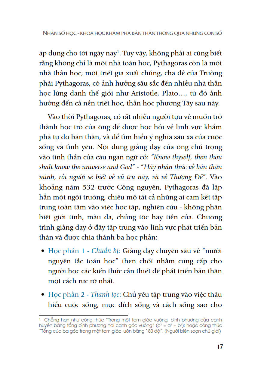 Nhân số học là một môn nghiên cứu sự tương quan giữa những con số trong ngày sinh, cái tên với cuộc sống, vận mệnh, đường đời và tính cách của mỗi người. Bộ môn này đã được nhà toán học Pythagoras khởi xướng cách đây 2.600 năm và sau này được nhiều thế hệ học trò liên tục kế thừa, phát triển.
