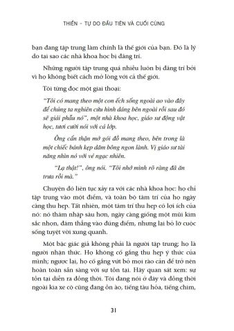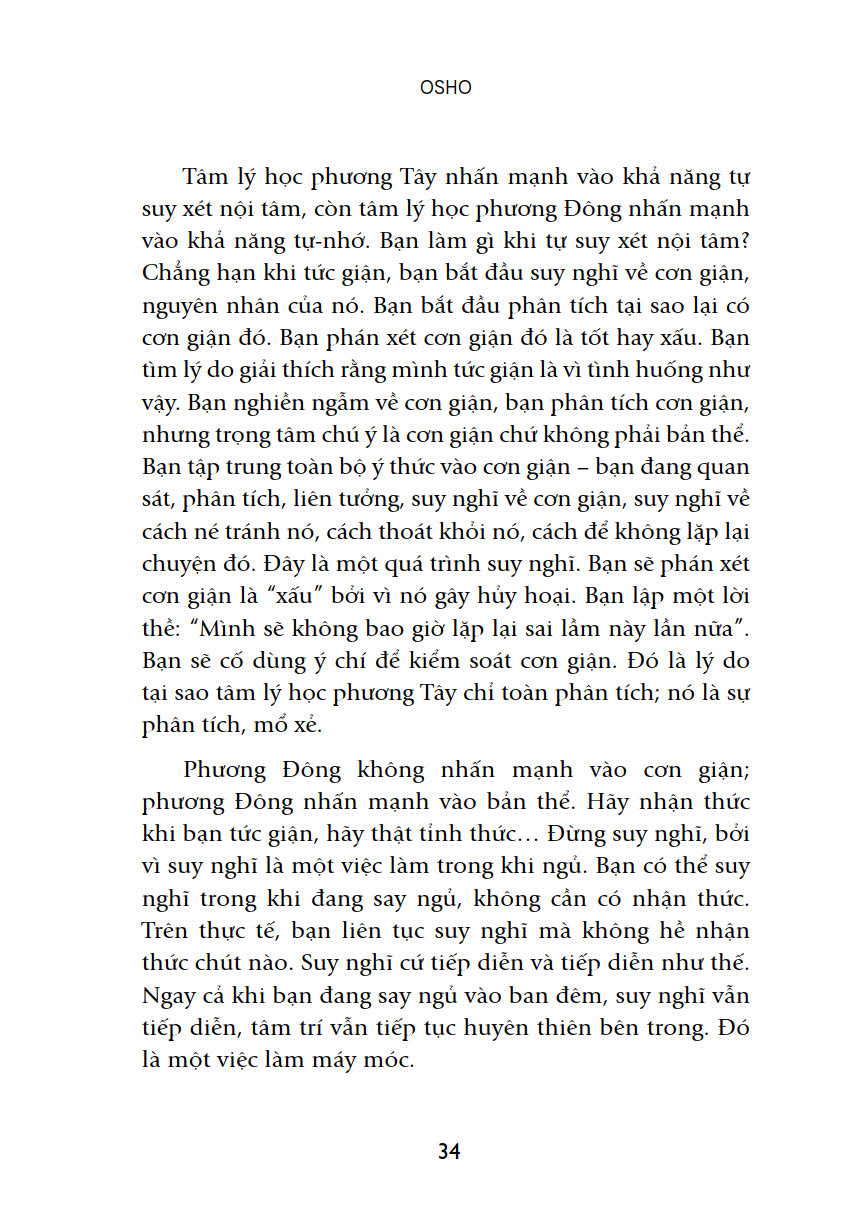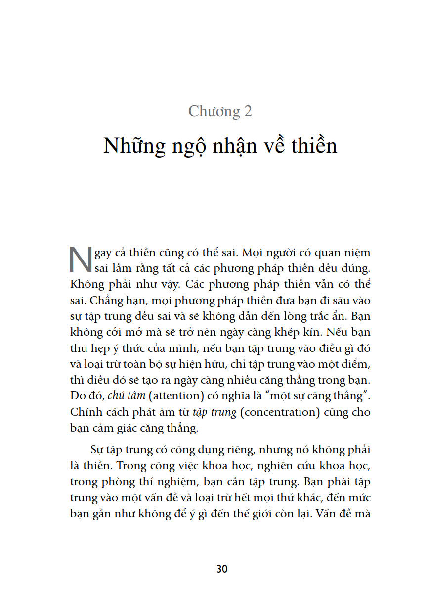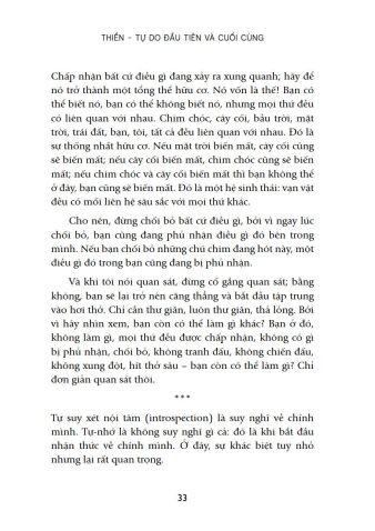 Tuy nhiên, bạn phải nhận thức rằng thiền không phải là phương pháp. Thiền đơn giản là nhận thức. Nhưng khoảng cách giữa bạn và nhận thức cuối cùng đó rất xa, nên bạn mới cần những phương pháp để thu hẹp khoảng cách. “Rồi bỗng một ngày, thiền sẽ tiếp diễn nhưng bạn không bị đồng nhất với nó. Bạn sẽ ngồi tĩnh lặng phía sau, bạn sẽ quan sát nó. Ngày đó, thiền tự xảy ra”.