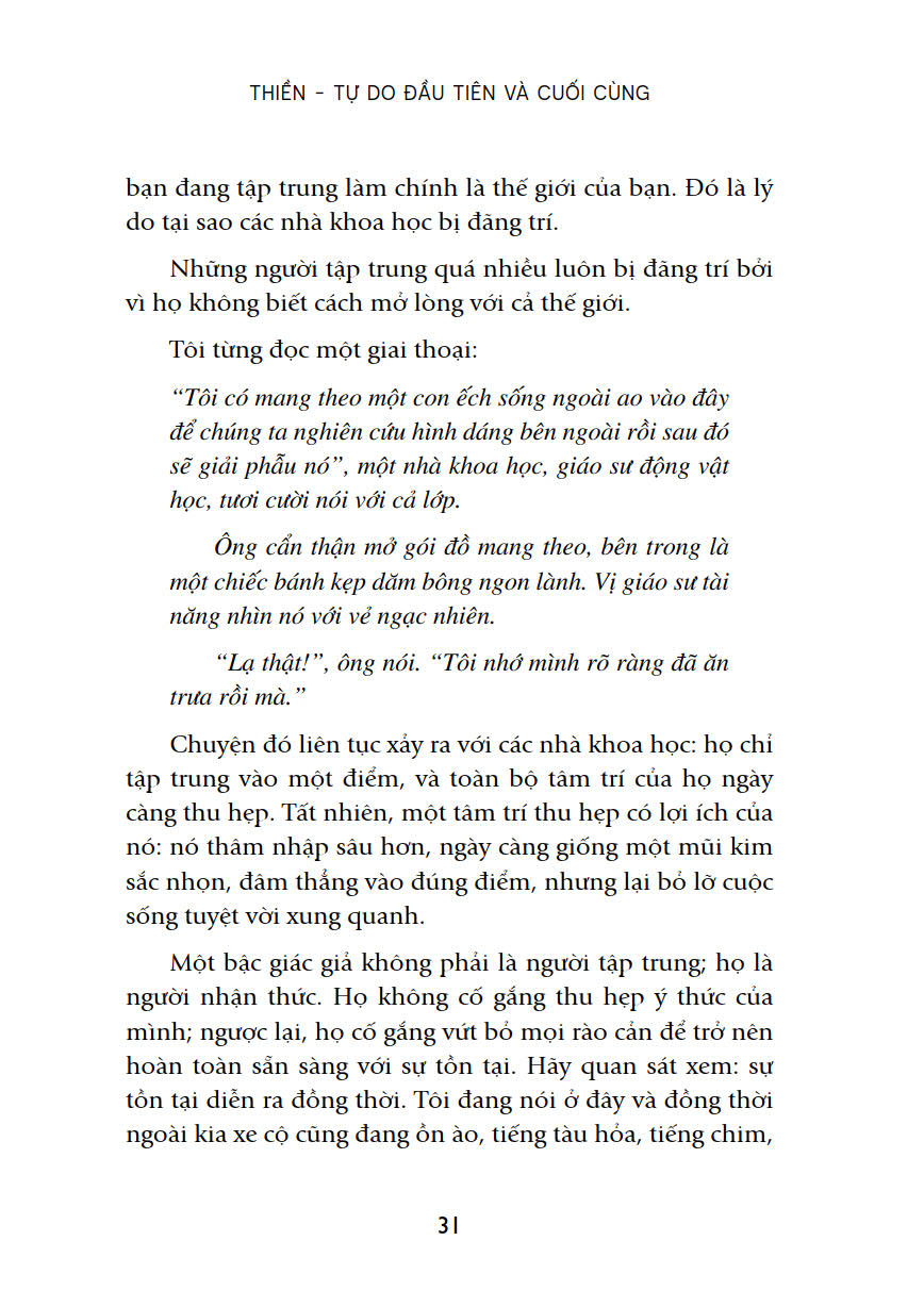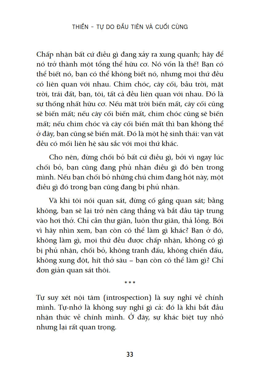 Đúng như tựa đề “Thiền – Tự do đầu tiên và cuối cùng” (Meditation: The first and last freedom), trong tác phẩm này Osho bàn về phương pháp duy nhất giúp con người đạt được tự do tuyệt đối: thiền. Nhờ thiền mà ta có được những giây phút hiện diện, ở đây và bây giờ. Nhờ hiện diện mà ta tỉnh thức. Và một khi tỉnh thức, ta sẽ có được tự do.