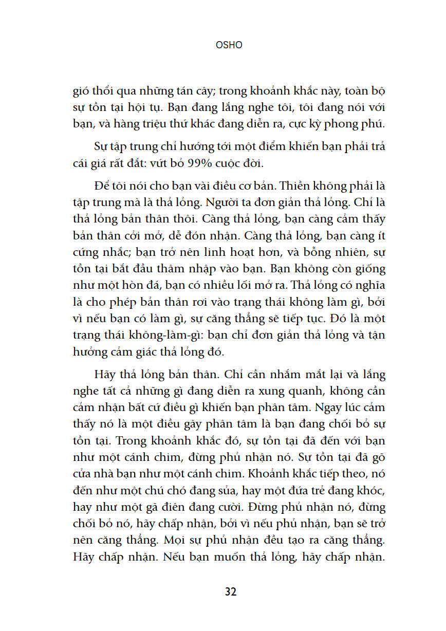 Osho (1931 – 1990) là một nhân vật “ngoại hạng”, bởi vì ông không thể được xếp vào một trường phái cụ thể nào. Hàng ngàn bài giảng ông chia sẻ bao trùm mọi chủ đề - từ việc khám phá ý nghĩa tồn tại của bản thân cho đến những vấn đề khẩn thiết nhất của xã hội đương thời hay vấn đề liên quan đến chính trị. Osho nói: “Hãy nhớ, bất cứ điều gì tôi đang chia sẻ không chỉ dành cho bạn… mà tôi cũng đang trò chuyện với cả những thế hệ tương lai nữa”.