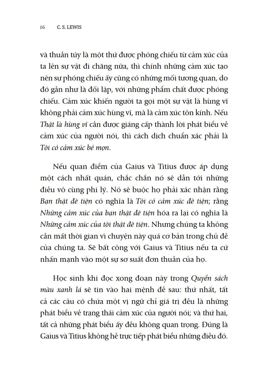 Ở phần hai, Lewis chứng minh rằng dù những người đổi mới muốn vạch trần các giá trị là cảm tính, muốn đả phá cái cũ đến đâu đi nữa, thì họ vẫn phải thừa nhận rằng có một số giá trị là hiển nhiên đúng, làm nền tảng cho tất cả những giá trị khác, những giá trị đó không cần phải chứng minh.