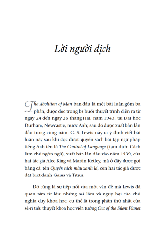 “Triệt tiêu Con Người” (The Abolition of Man) tập hợp ba bài giảng về giáo dục mà Clive Staples Lewis đã trình bày trong ba đêm tại Đại học Durham, nói lên thân phận con người và những dự cảm về tương lai.